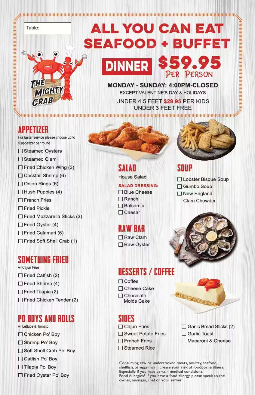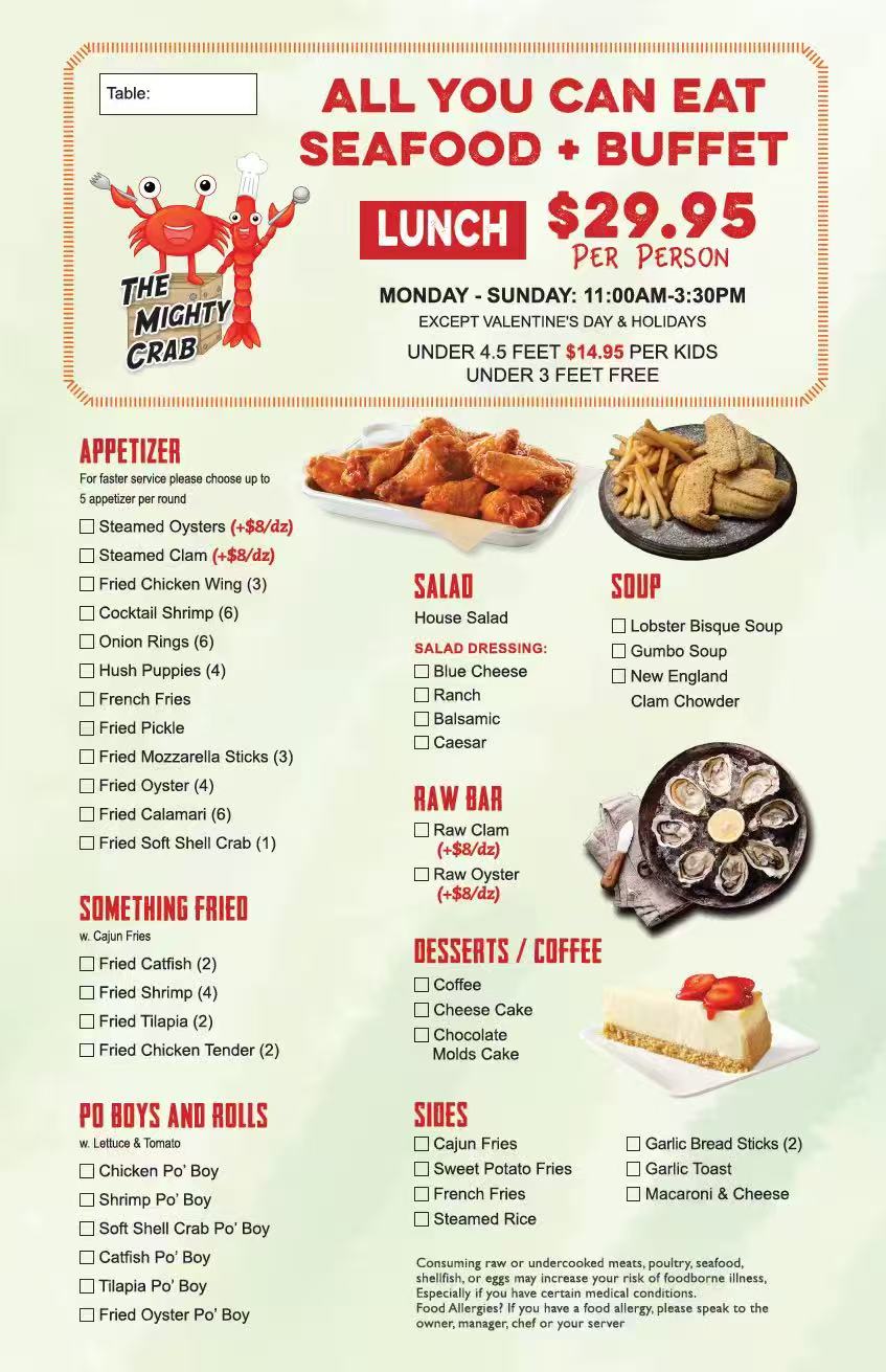 - Adult Pricing: $29.95 per person (fixed rate for unlimited access to the buffet)
