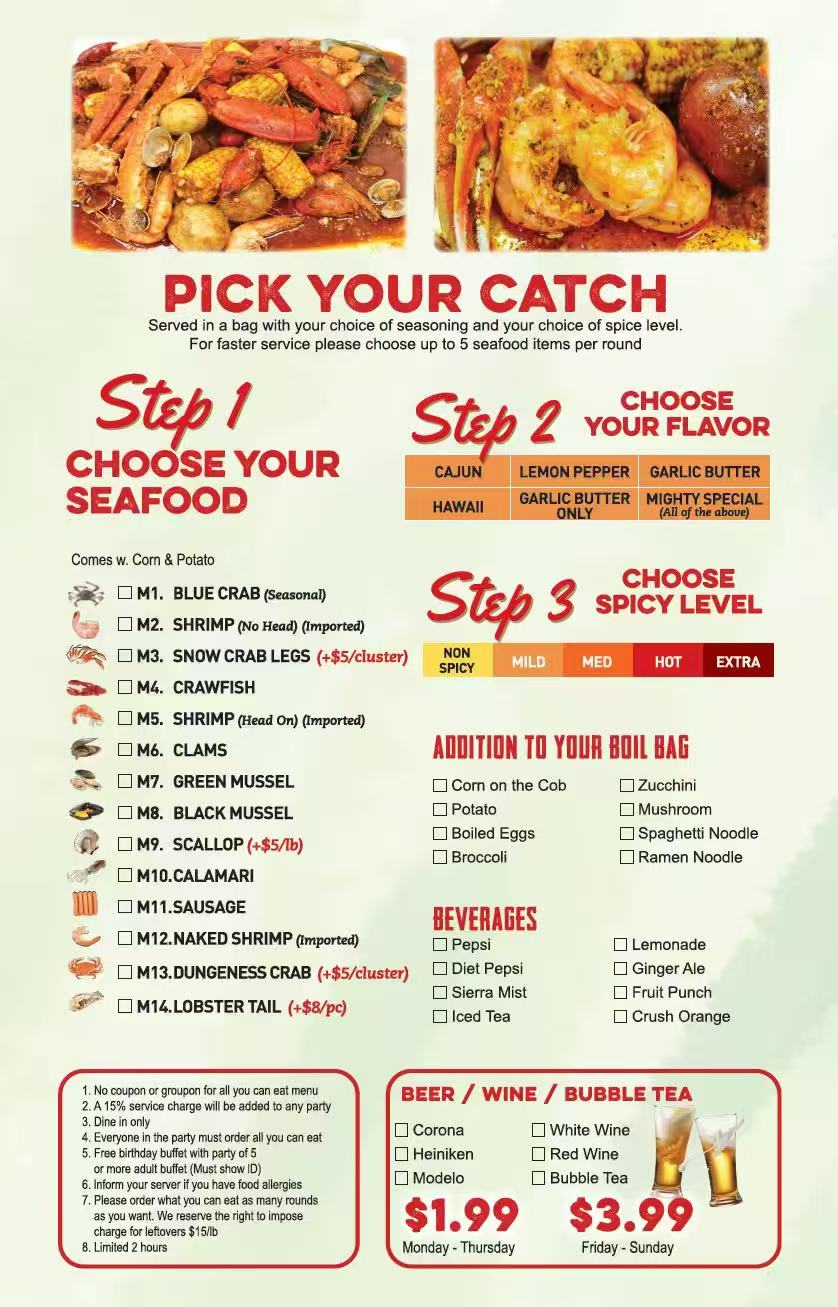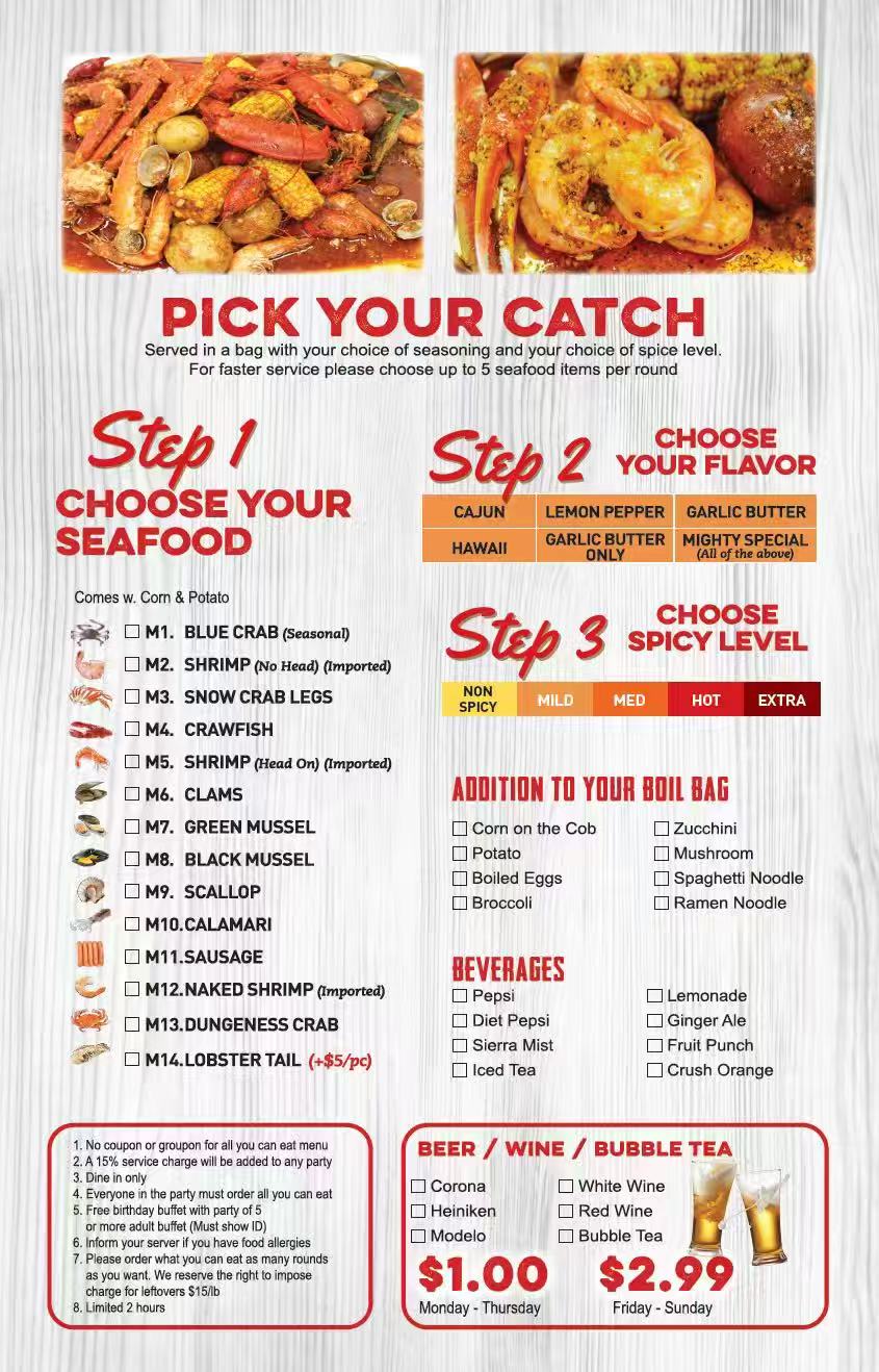 - No coupon or groupon for all you can eat menu: Discount coupons or groupons are not valid for the all-you-can-eat seafood boil.